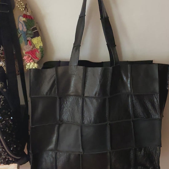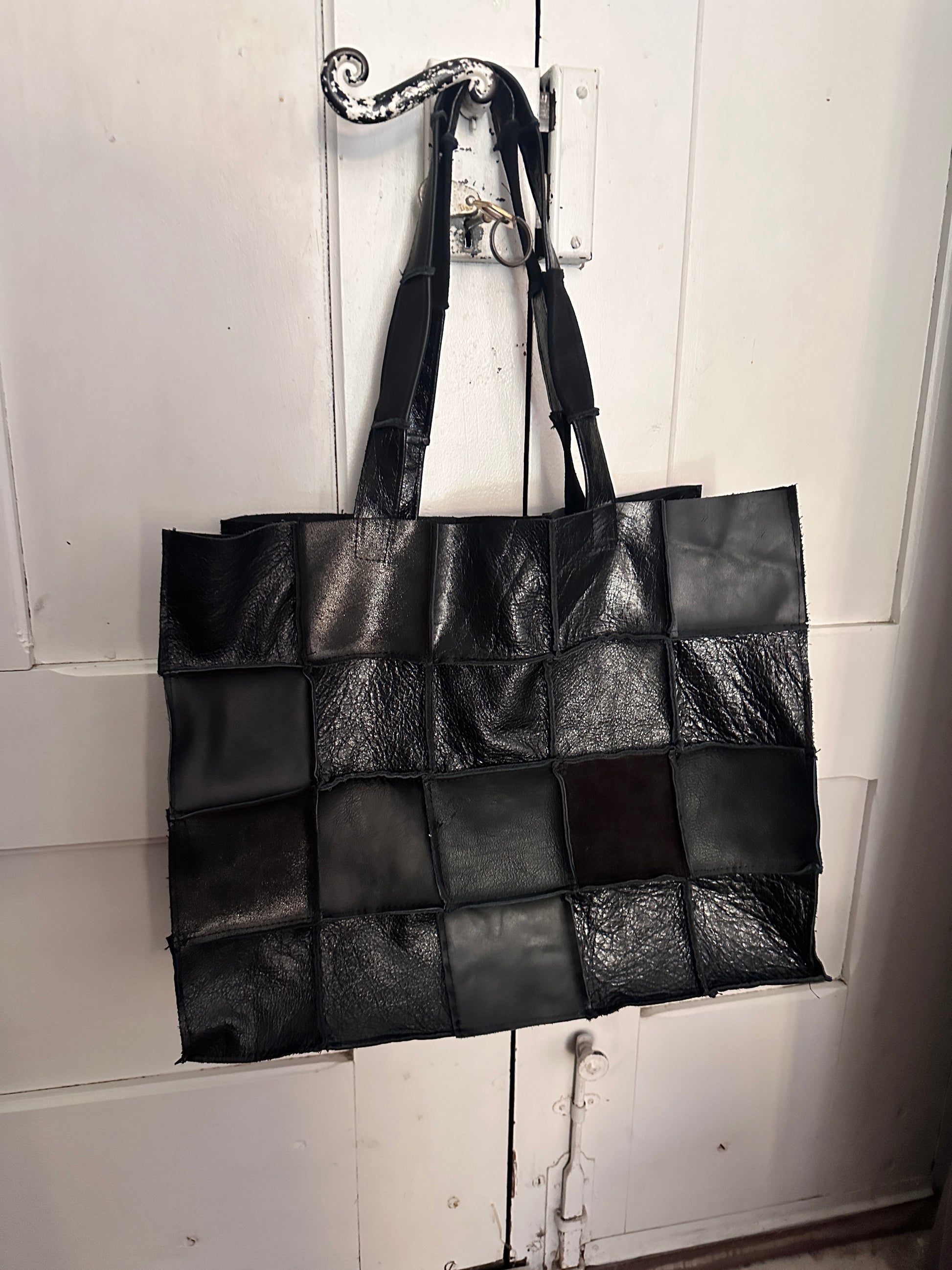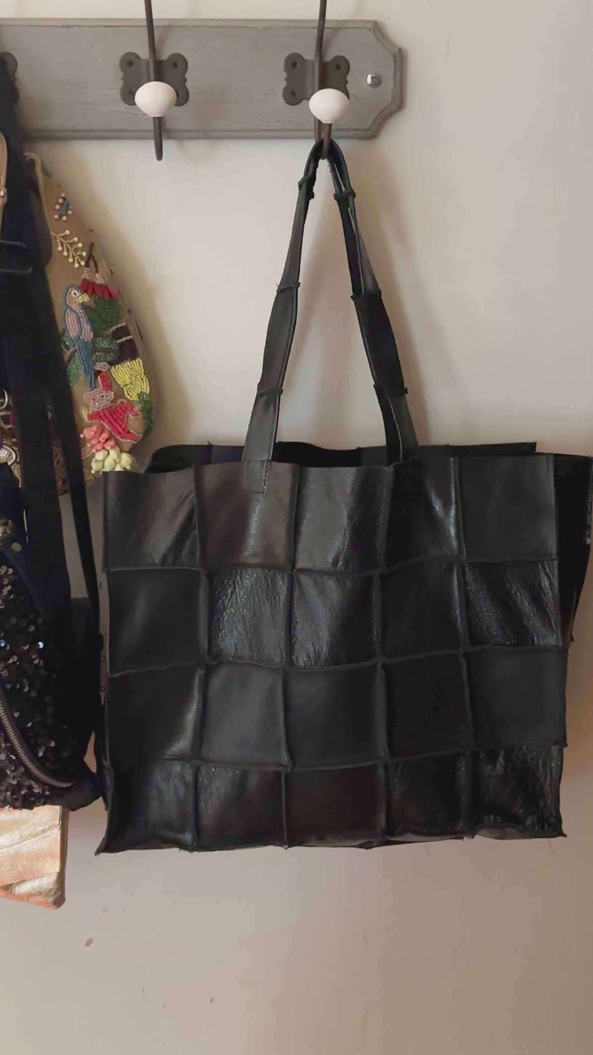 Grand Sac Porté Épaule en Cuir Italien Noir – Patchwork Unique